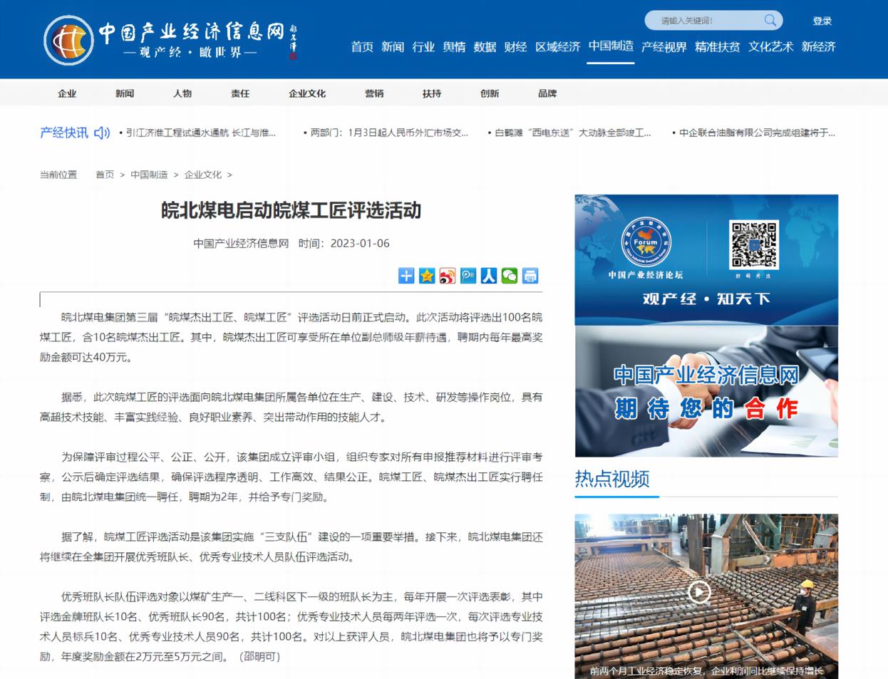 1月6日中国产业经济信息网:皖北煤电启动皖煤工匠评选活动