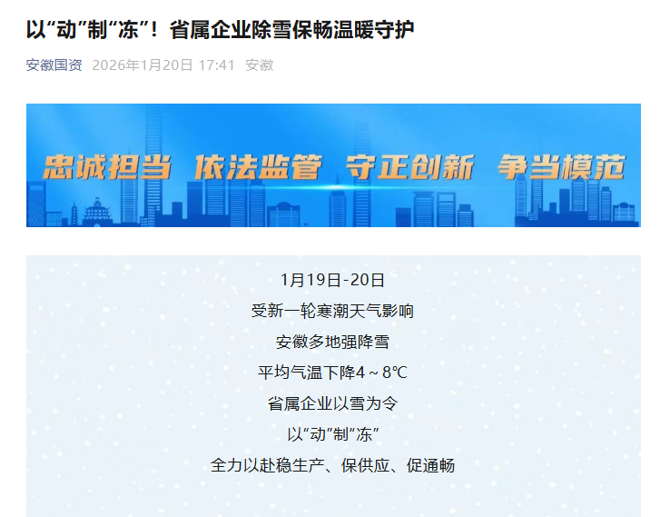 1月20日安徽国资微信公众号:以“动”制“冻”!省属企业除雪保畅温暖守护